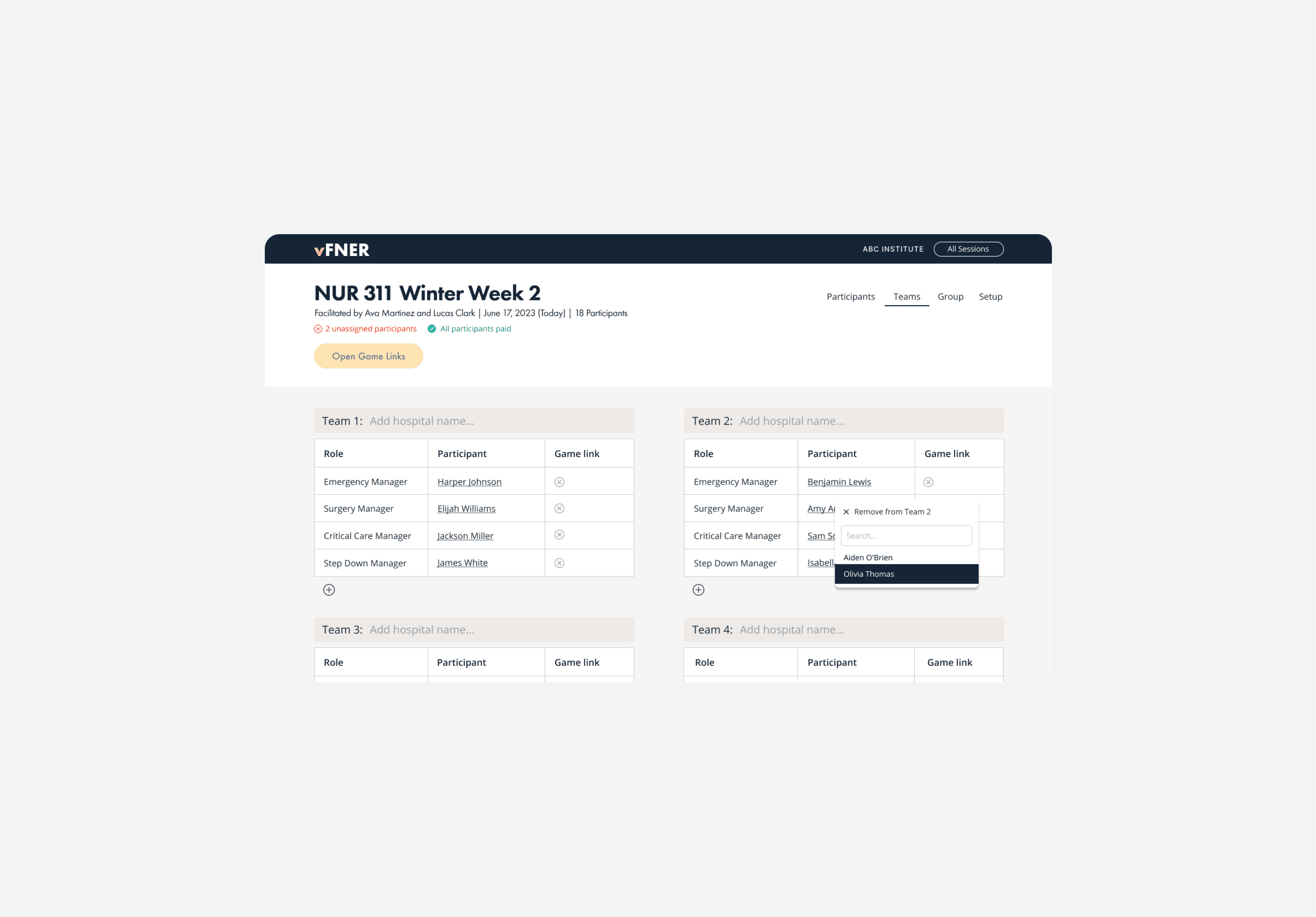 vFNER delivers a gripping 60-minute real-time hospital simulation supporting 50–250 simultaneous participants, with teams of four managing interdependent departments amid patient surges, resource shortages, surprise events and hard budget constraints — all experienced through a browser plus a native iOS/Android companion app that provides QR login, role cards, team chat, critical push alerts and personal reflection journals.